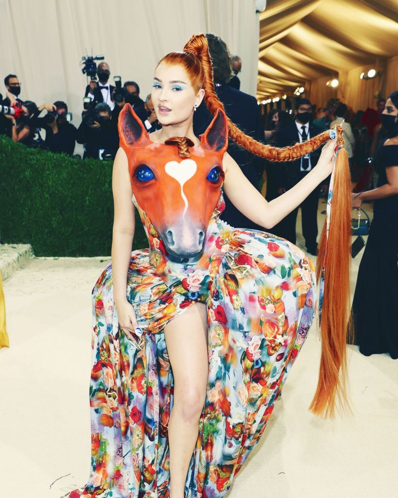 Kim Petras came into the 2021 Met Gala wanting to make a statement, and she sure did. Petras wore a Collina Strada dress which showcased a unique pattern along with a 3D horse head bustier. When asked about her look, Petras said, “Okay, yes, [I] was a horse girl in my past life, and now [I’m] a fashion girl!” The abstract horse bustier had many critiques questioning the dress’s place in fashion. It’s clear that she was attempting to hit the American theme by showcasing a “horse girl” inspired look, but the results were a total flop.